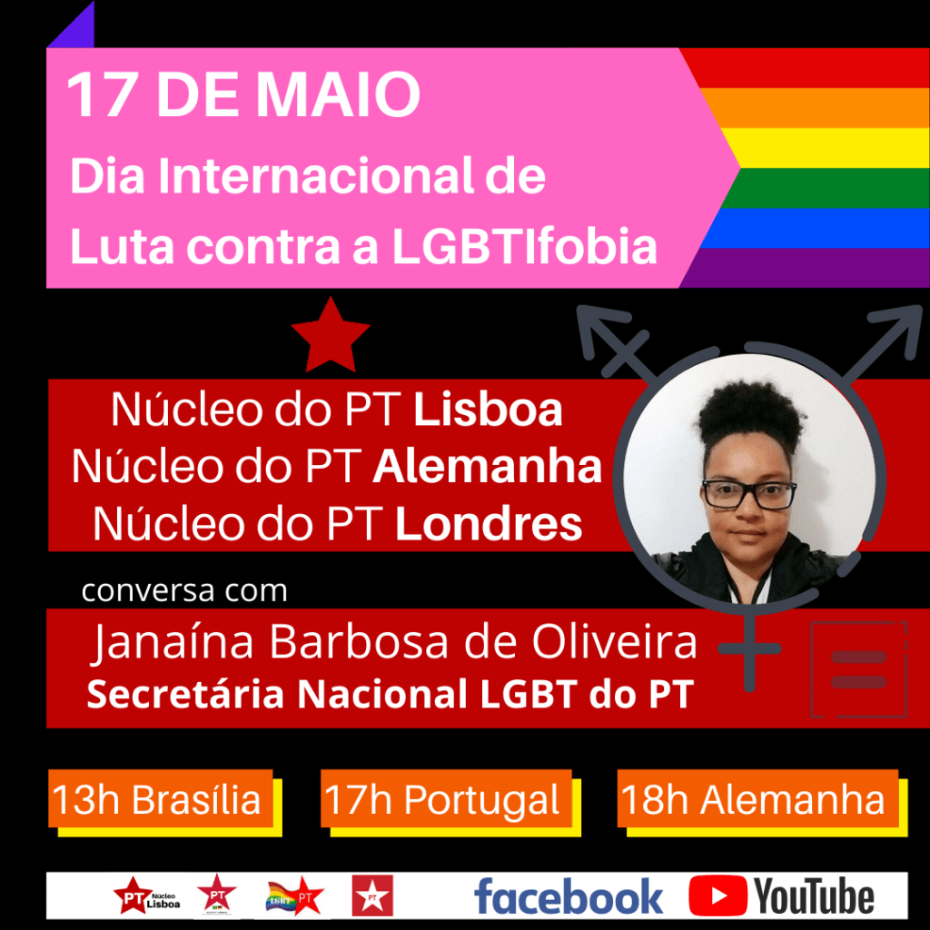 O PT assinala o Dia Internacional de Luta contra a homofobia, bifobia e transfobia com várias atividades neste domingo, 17. O Núcleo do PT Lisboa, o Núcleo do PT Alemanha e o Núcleo do PT Londres organizam em conjunto um evento nas redes sociais. O diálogo tem início às 13 horas em Brasília, 17 horas em Portugal e 18 horas na Alemanha.