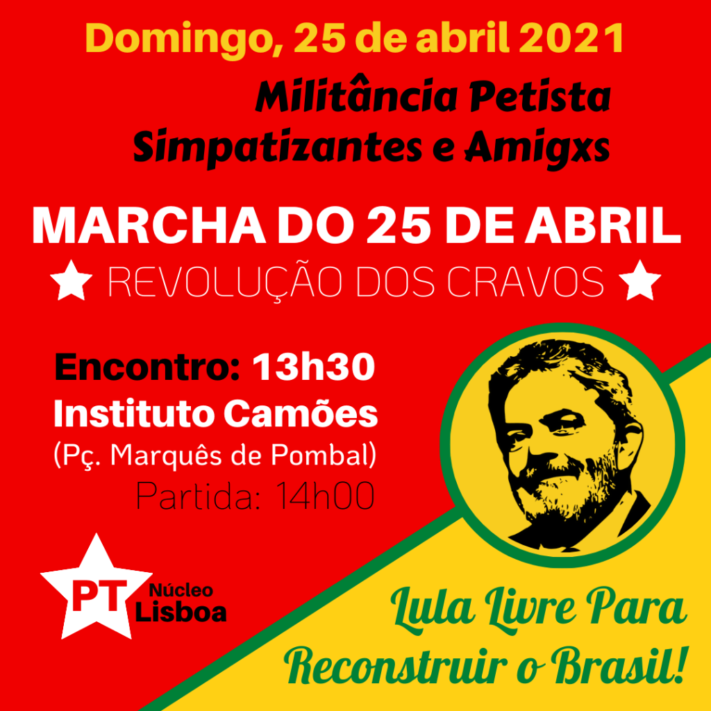 Em 2021, voltamos às ruas em defesa da democracia, solidariamente com nossos companheiros e companheiras de Portugal, frisando a inocência de LULA, nossa maior liderança política, que recuperou seus direitos políticos, contra o fascismo, pela retomada de um projeto popular e democrático para o Brasil. Confira abaixo todas as informações. Respeite as normas de saúde pública. Traga seu cartaz e participe!